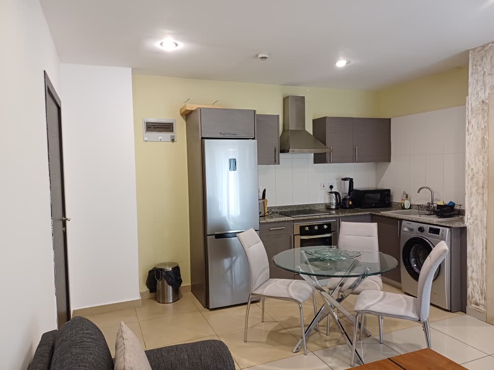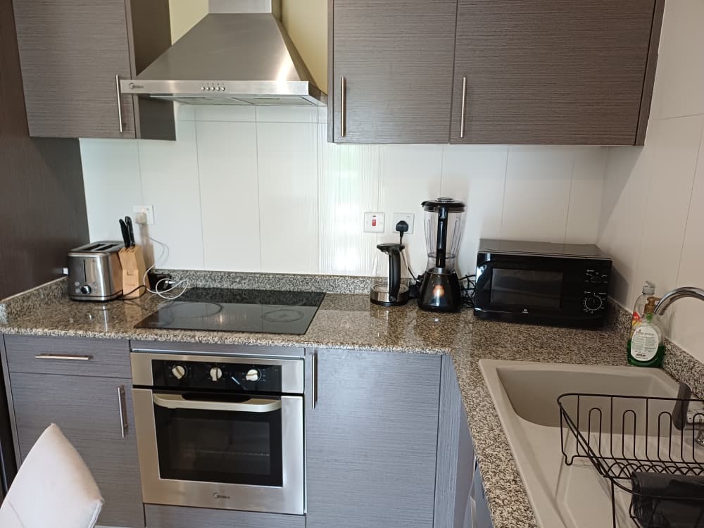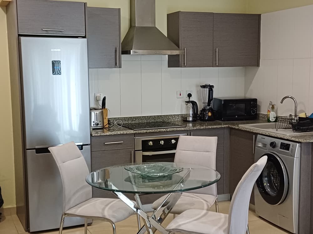 • Fully-Equipped Kitchen: Culinary enthusiasts will appreciate the modern kitchen, complete with essential appliances including a refrigerator, electric stove, microwave, toaster, blender, electric kettle, and a washing machine.
